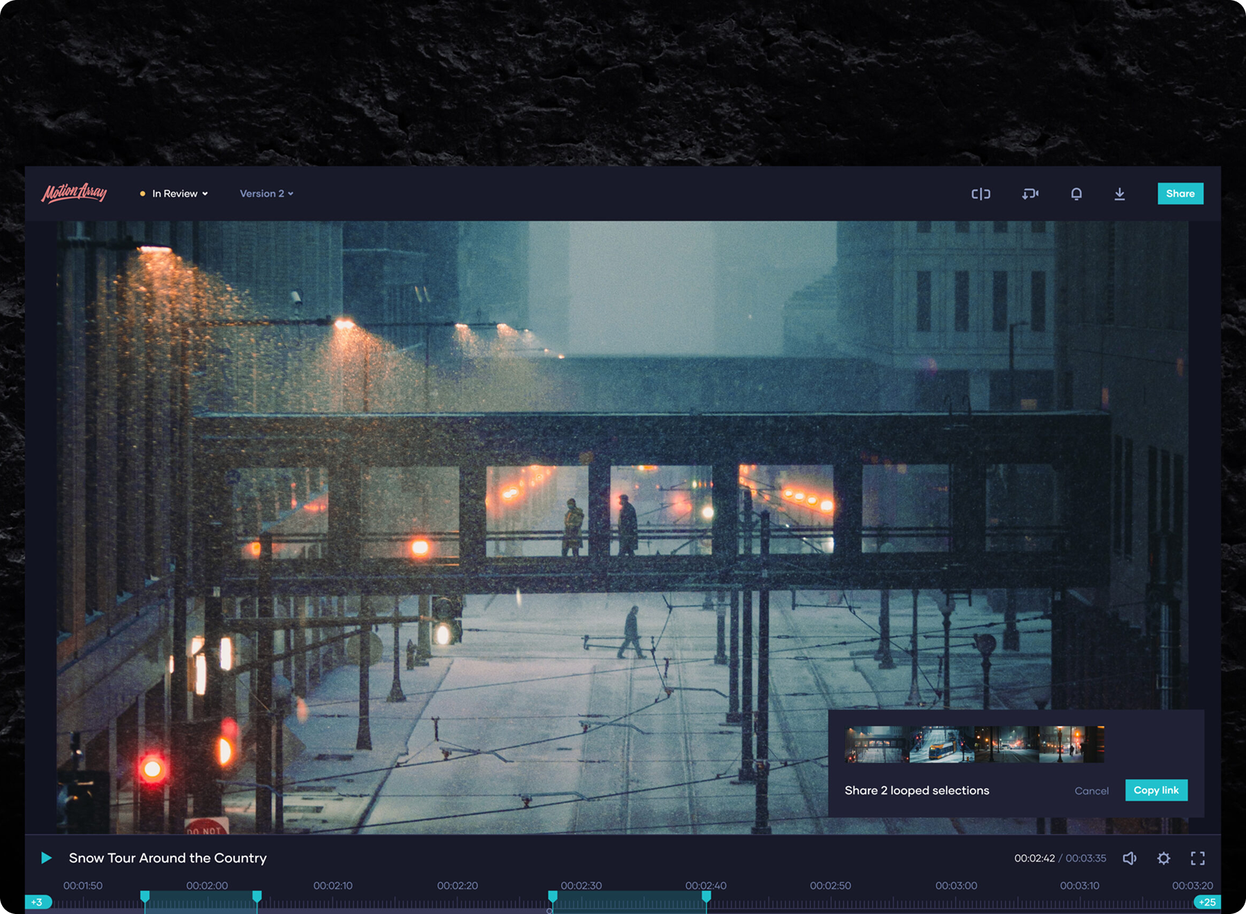Expanding beyond standard project-level sharing, we introduced "looped section sharing" to allow creators to isolate and share specific segments of the timeline. This feature enables teams and clients to focus on granular details without the friction of reviewing an entire video or clarifying timestamps, streamlining the review process and ensuring feedback is always delivered in the correct context.