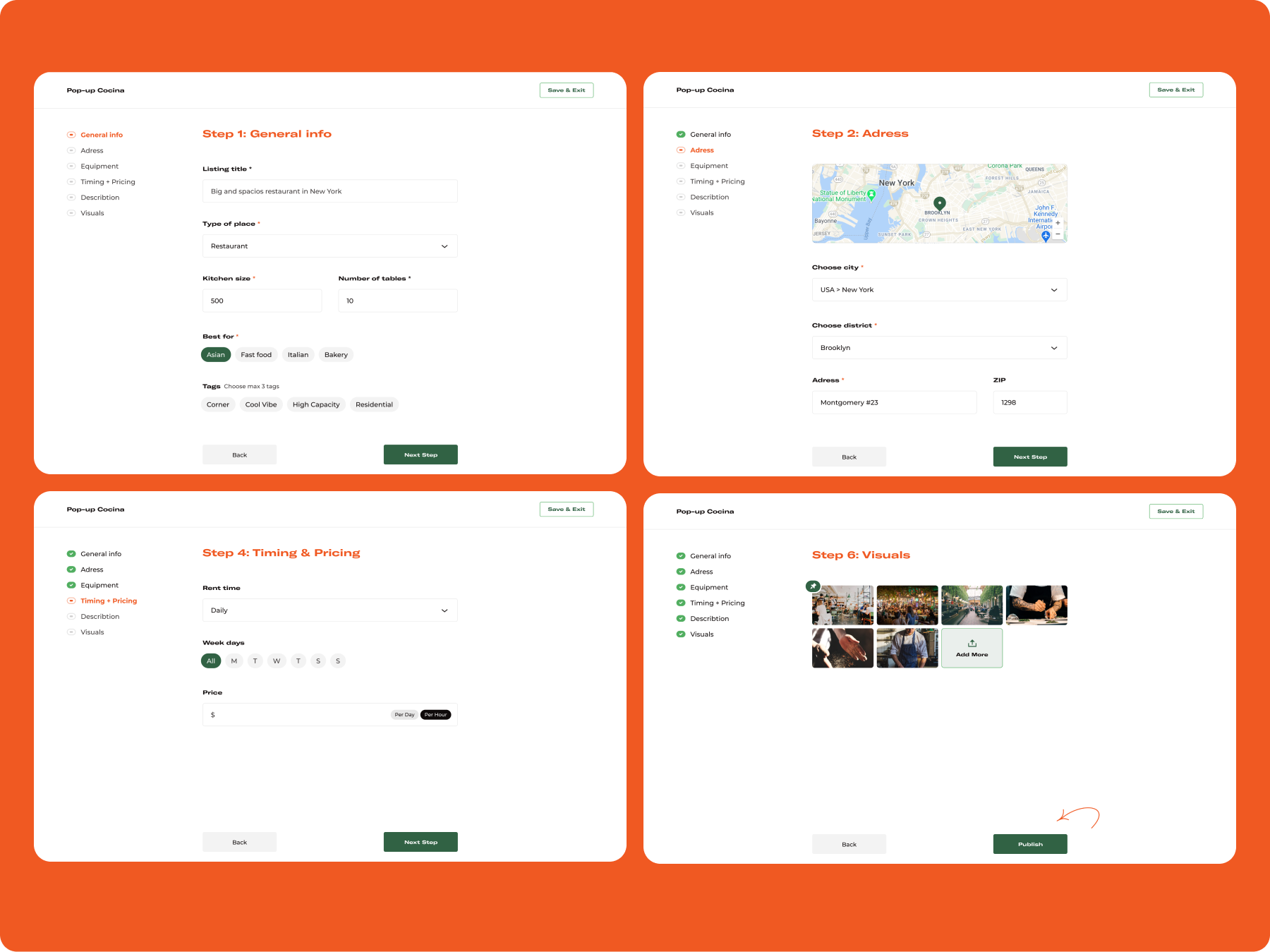 Since our target users were unfamiliar with kitchen-sharing platforms, we faced the challenge of designing a comprehensive onboarding flow that remains intuitive. We transformed a complex data-entry process into a guided, multi-step experience that minimizes friction for first-time providers.